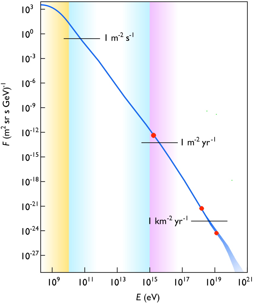 If you look at the energy curve (shown above), you’ll notice a shift in slope at three points. Top to bottom, they’re called the 'knee', the 'ankle', and the 'instep'. At each of these points, physicists believe, the set of physical effects producing the cosmic rays changes.